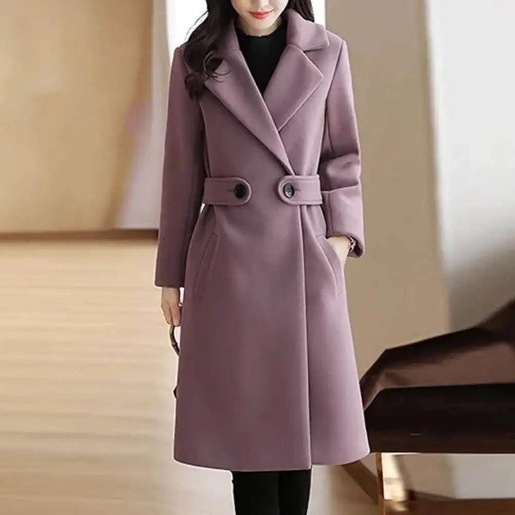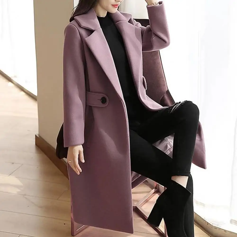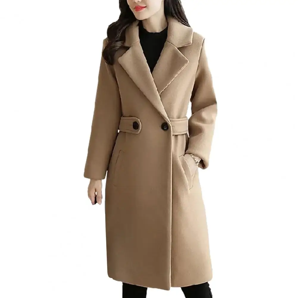 Fall Winter Women Overcoat Thick Solid Color Turn-down Collar Long Sleeve Cardigan Belted Button Closure Mid Length Loose Lady Coat
