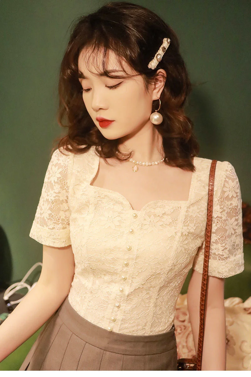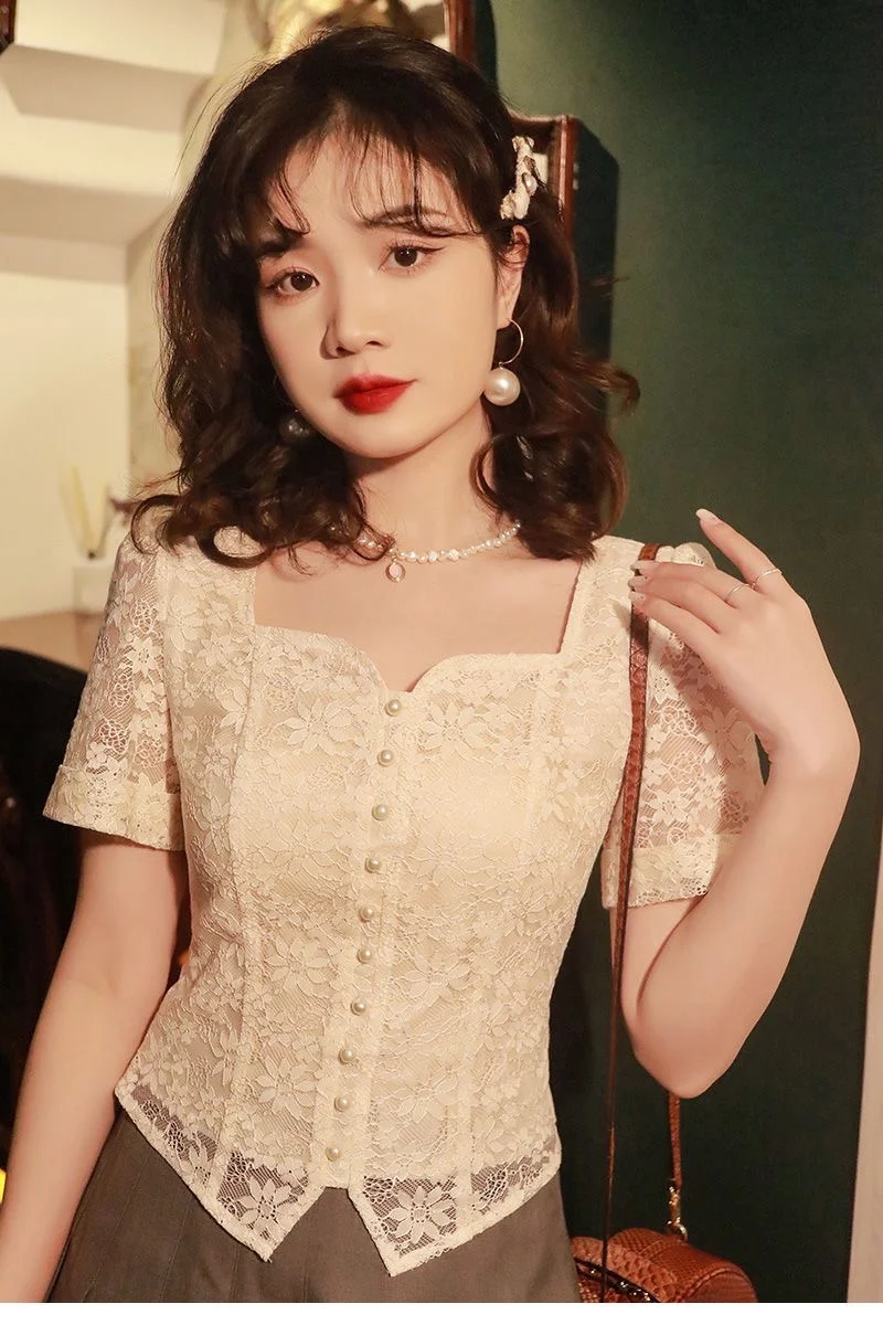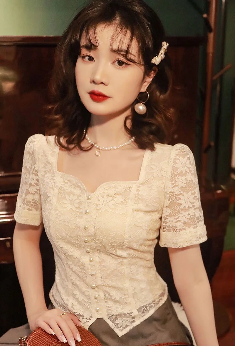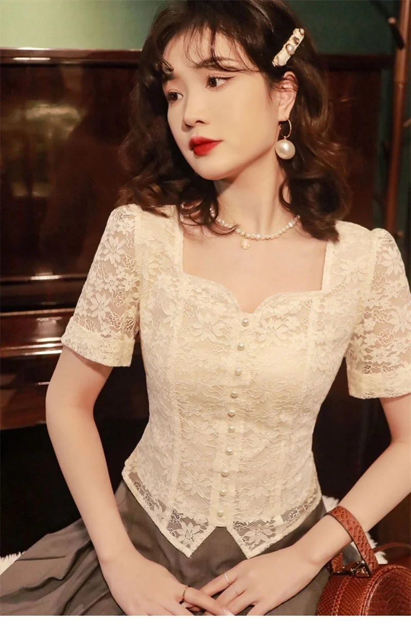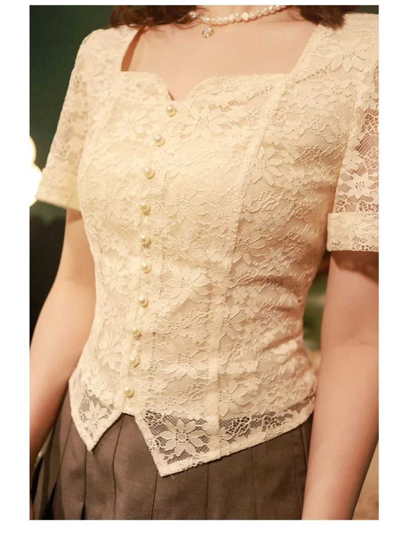 2025 New Summer Women Dress French Vintage Lace Shirt Short Sleeve Flower Embroidery Fairy Top Small Square Collar Drop Chic top
