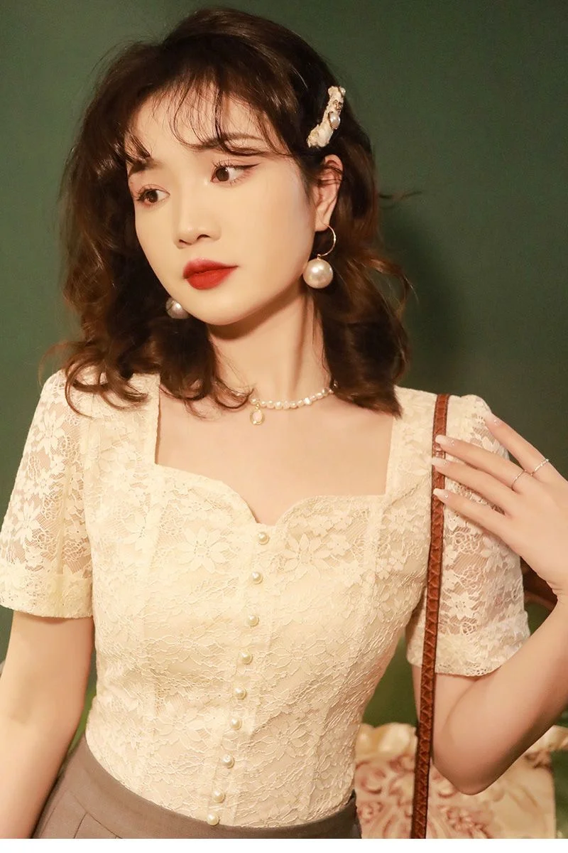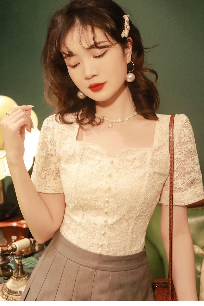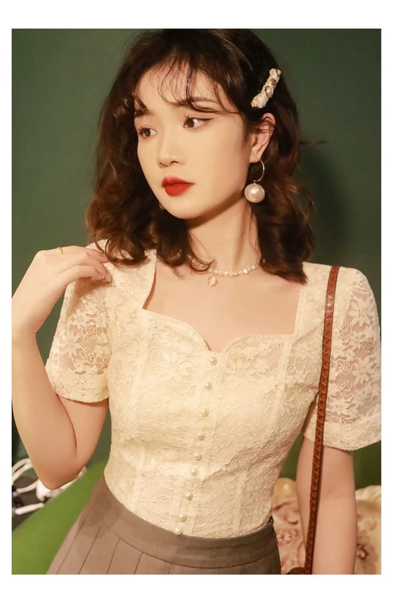 Be the first to review “2025 New Summer Women Dress French Vintage Lace Shirt Short Sleeve Flower Embroidery Fairy Top Small Square Collar Drop Chic top”