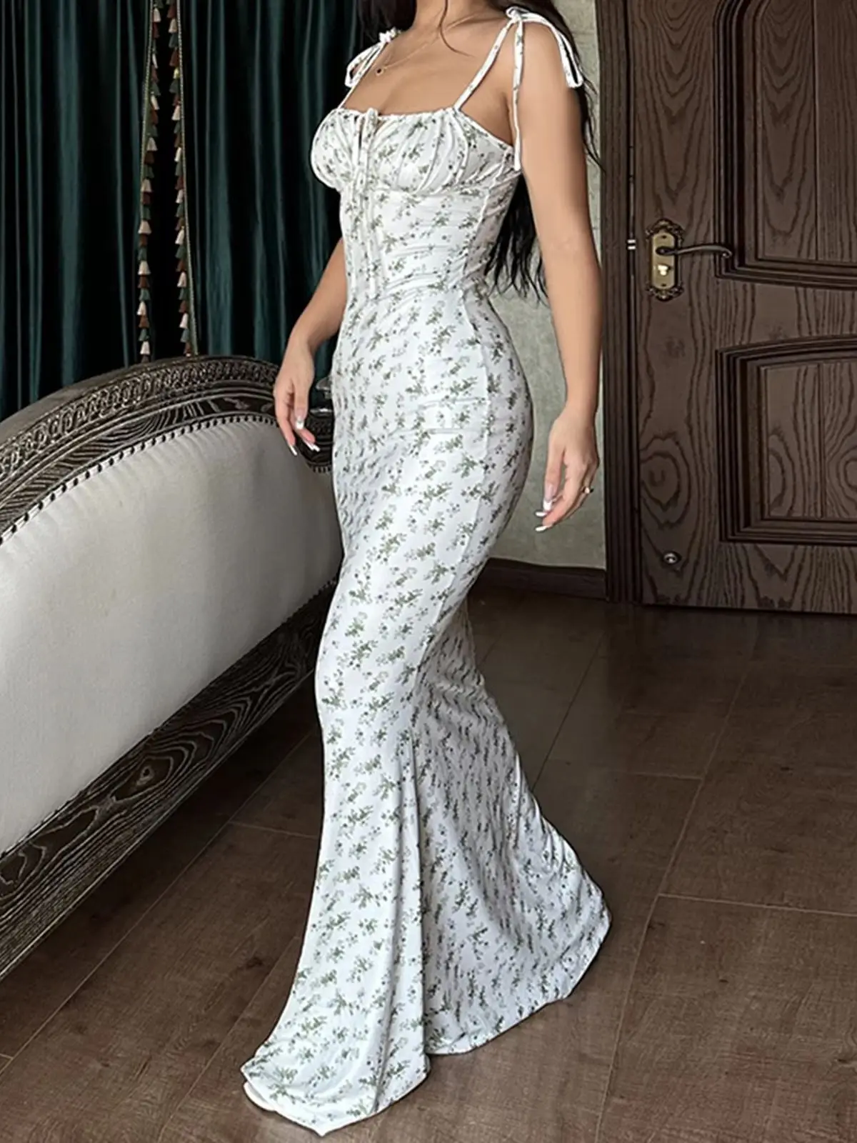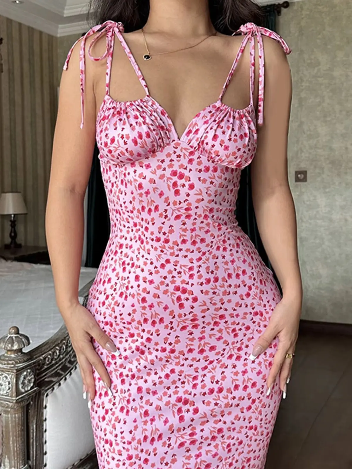 2025 Summer Floral Midi Dress Women Spaghetti Strap Tie-up V-neck Split Dress Sexy Vintage Elegant Dresses Female