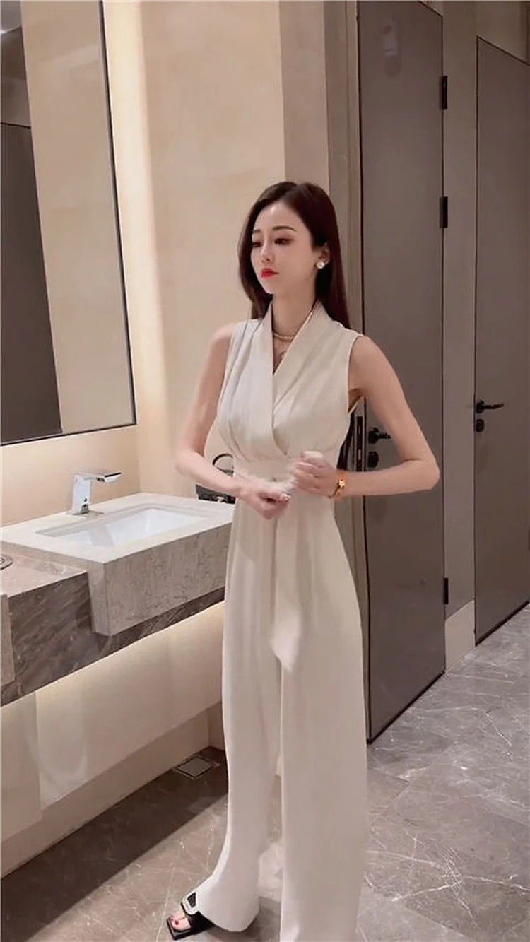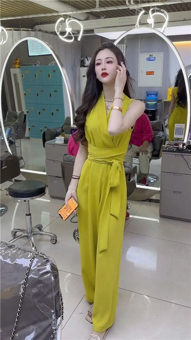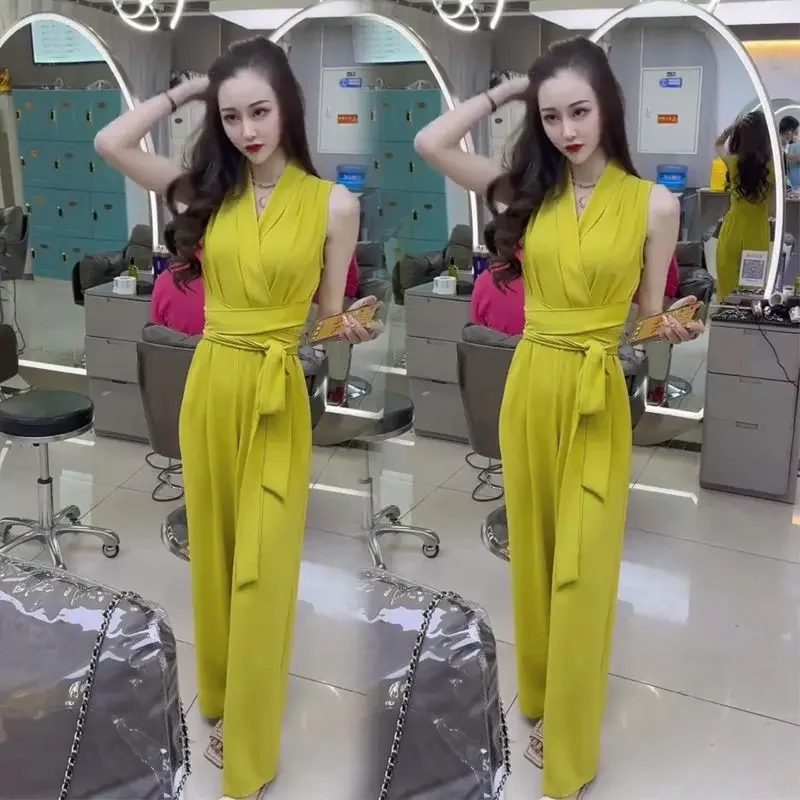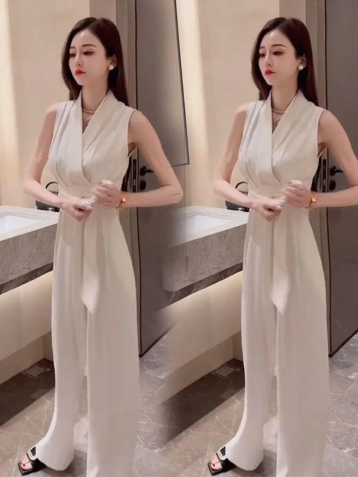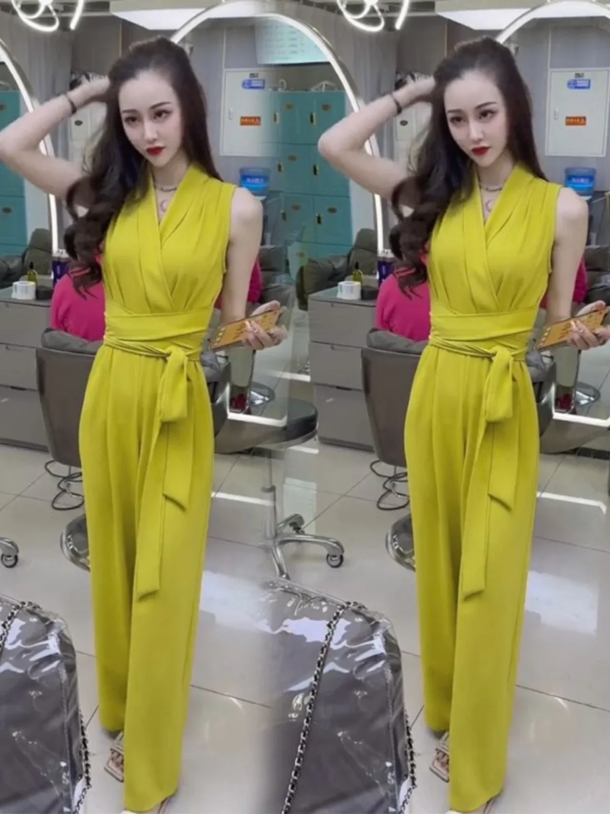 2025 Women’s Summer New V-neck Sleeveless Jumpsuit Female Solid Color Loose Rompers Ladies Fashion Long Wide Leg Pants P100