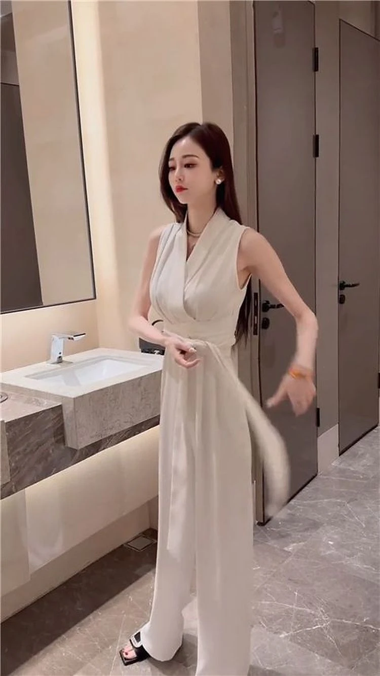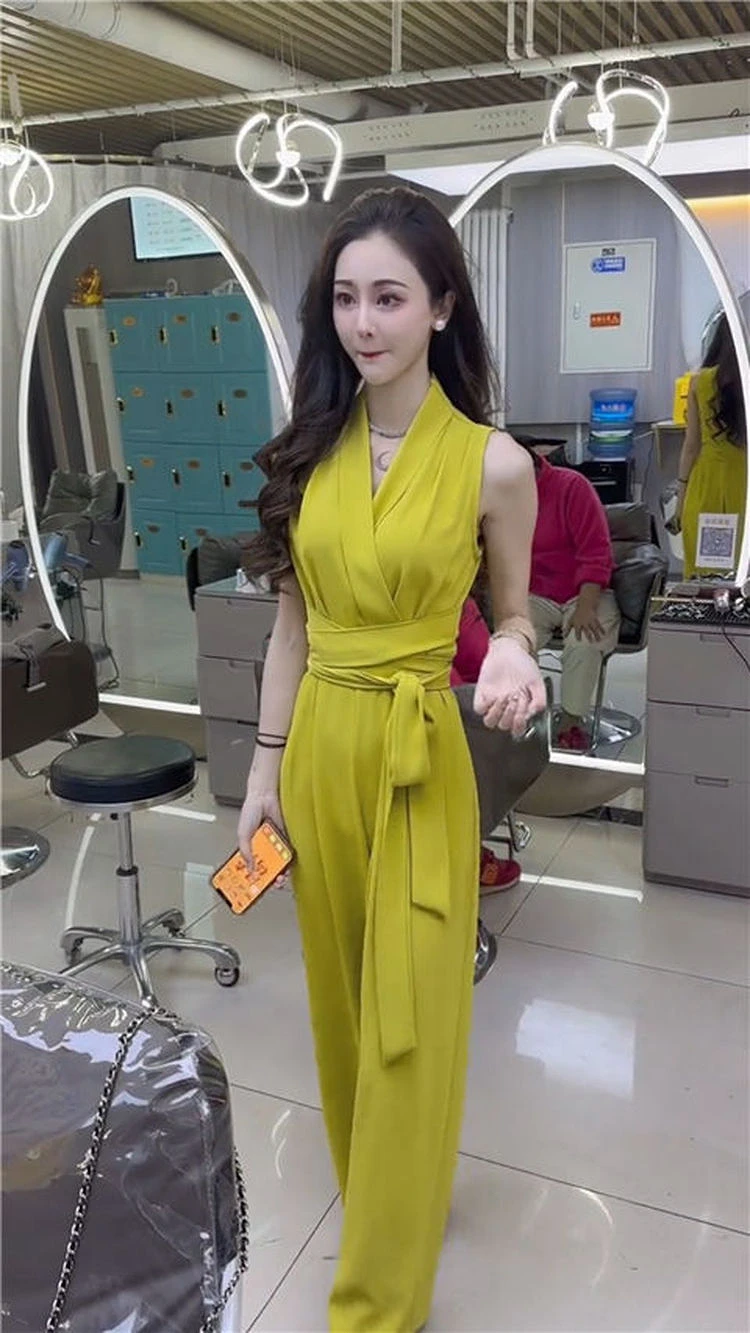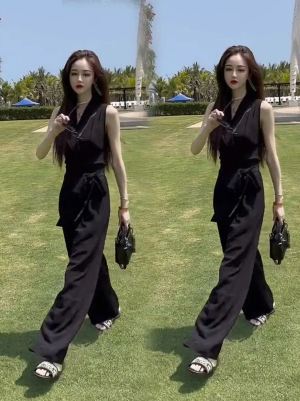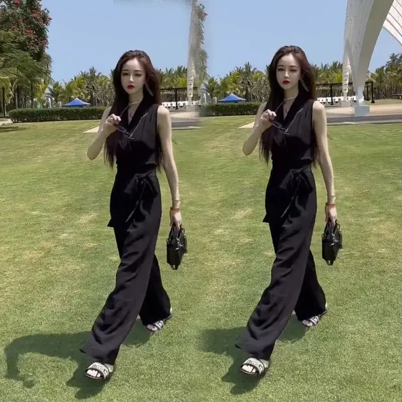 2025 Women’s Summer New V-neck Sleeveless Jumpsuit Female Solid Color Loose Rompers Ladies Fashion Long Wide Leg Pants P100