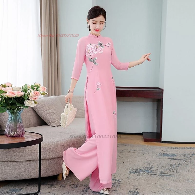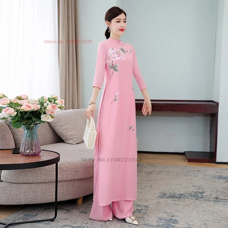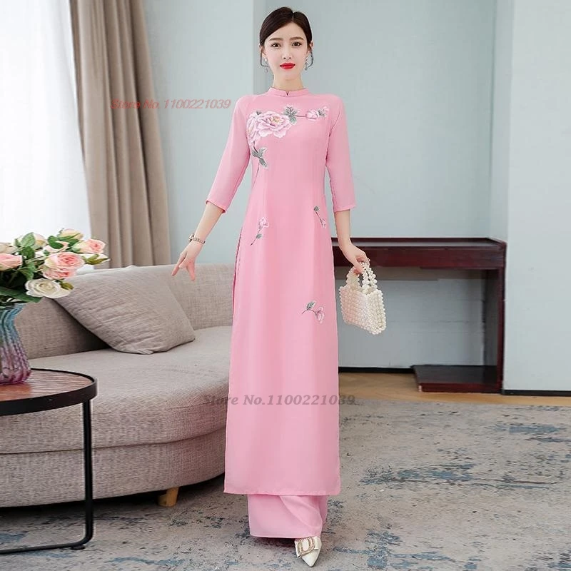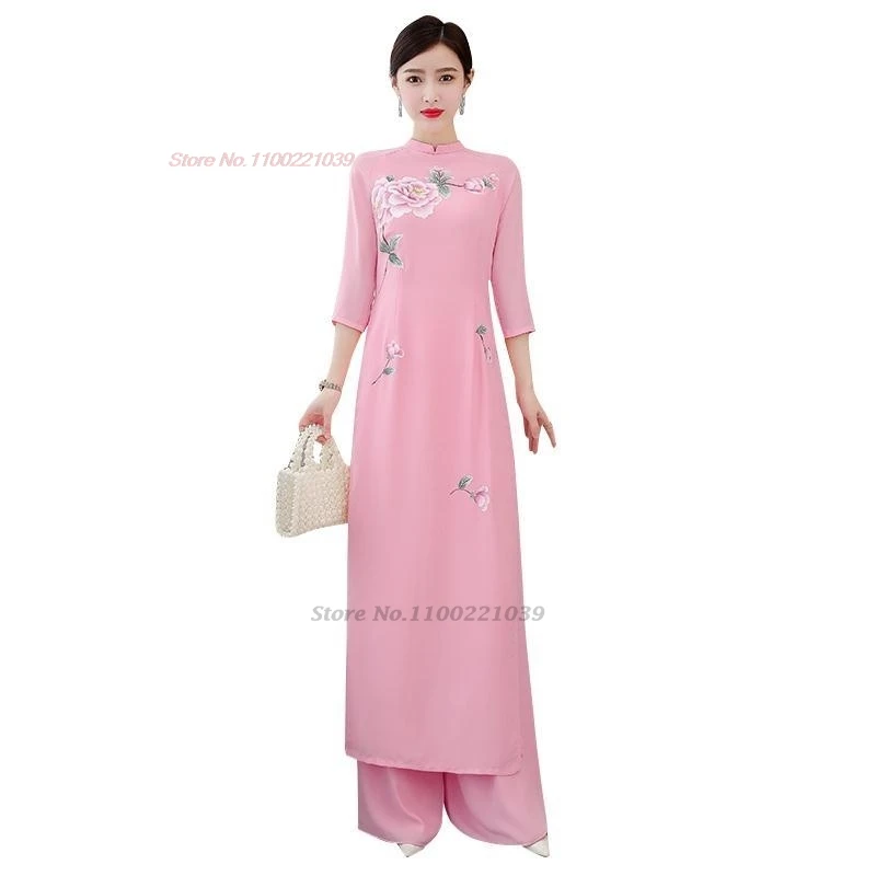2026 vietnam traditional aodai dress cheongsam dress+pants set national flower print vintage qipao dress party evening dress