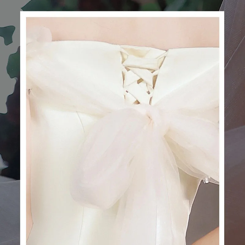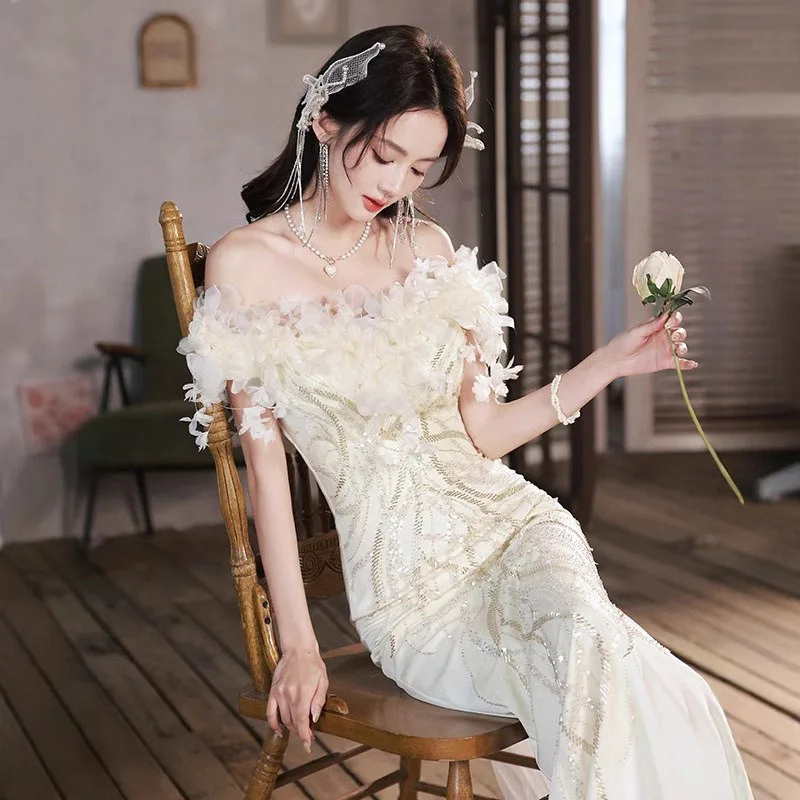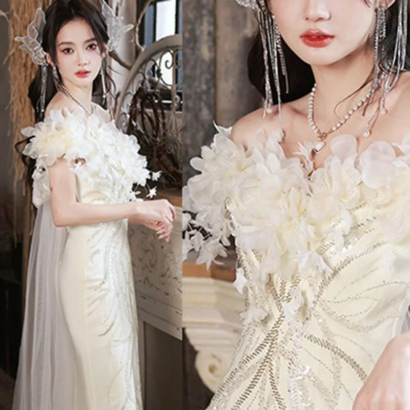 Beige white light luxury fairy evening dress new line shoulder waist fish tail banquet evening dress Customized