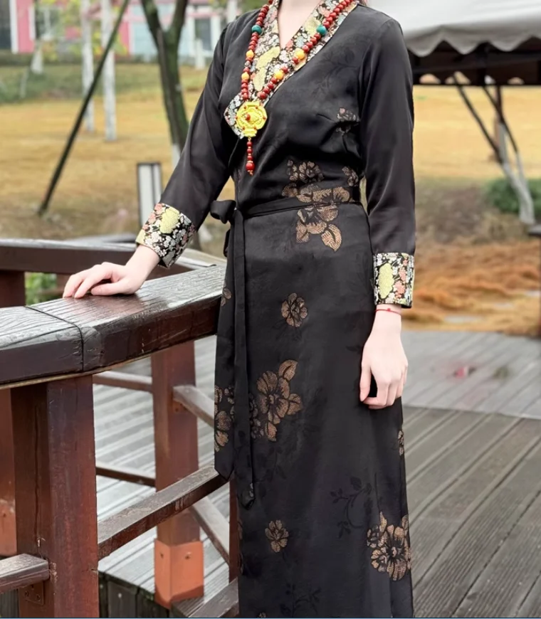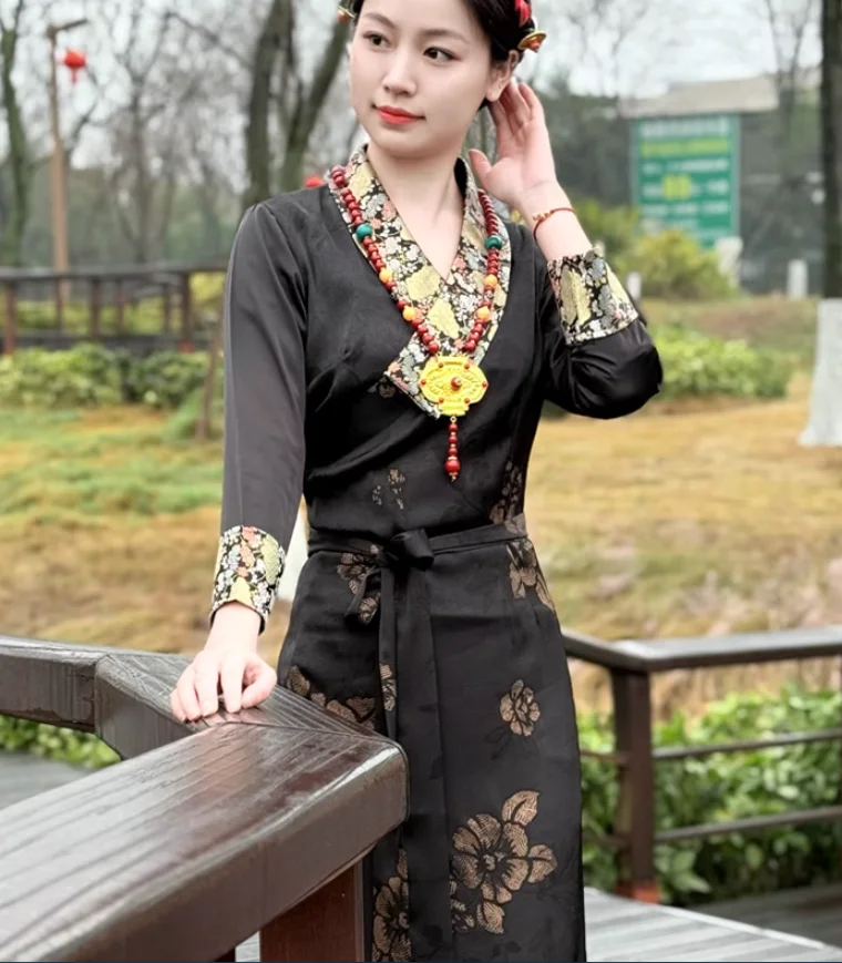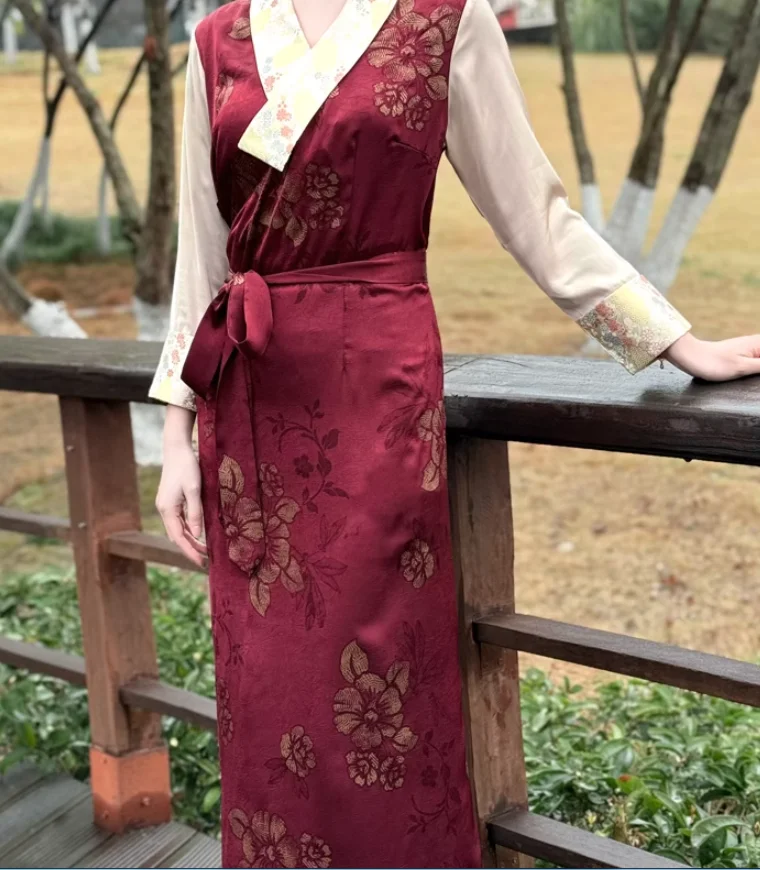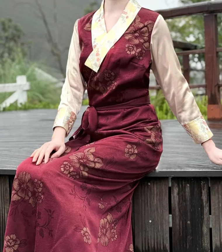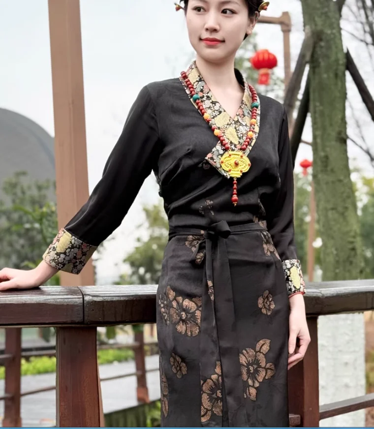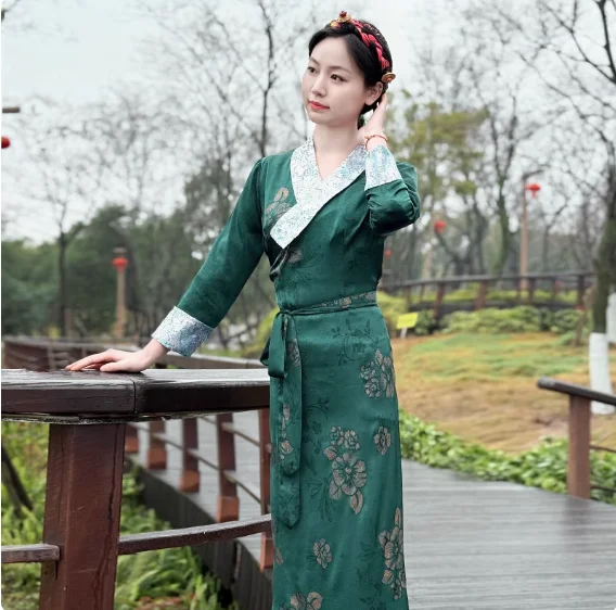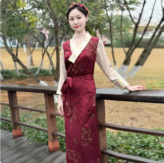 Chinese Spring Tibetan Women Stand Collar Bola Guozhuang Skirt Xizang Clothes