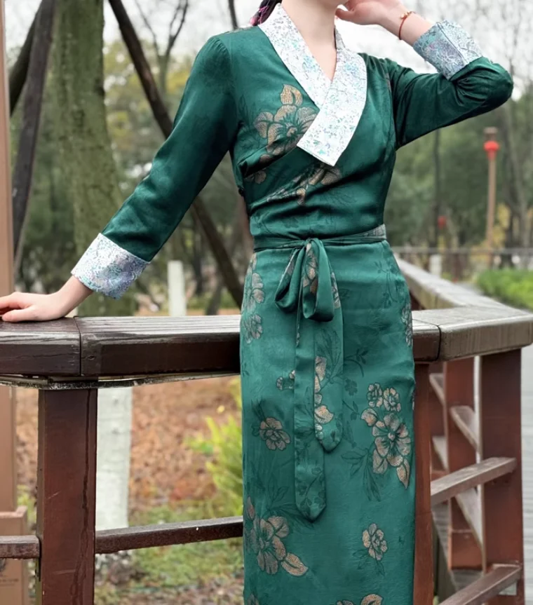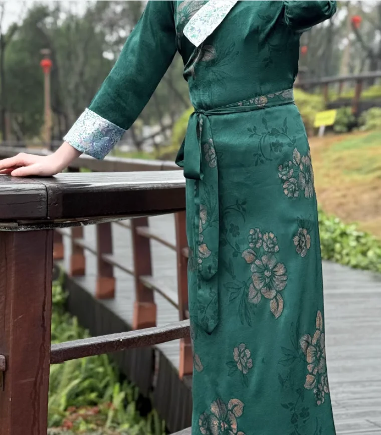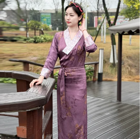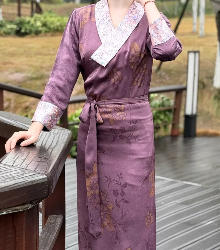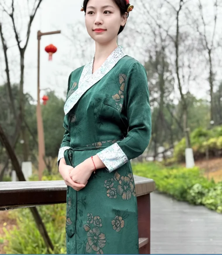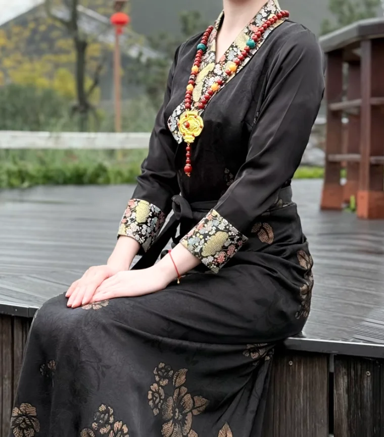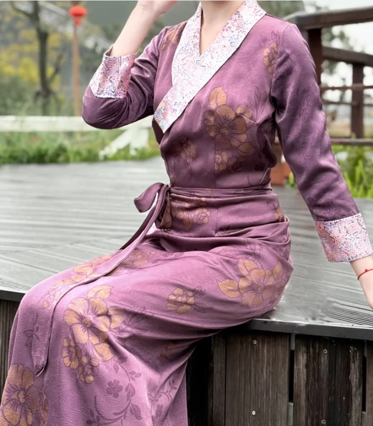 Chinese Spring Tibetan Women Stand Collar Bola Guozhuang Skirt Xizang Clothes
