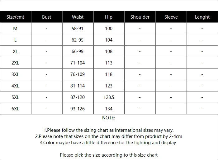 M within 45KG, L 45-50KG, XL 50-55KG, 2XL 55-65KG, 3XL 65-75KG, 5XL 85-95KG, 6XL 95-110KG, 4XL 75-85KG