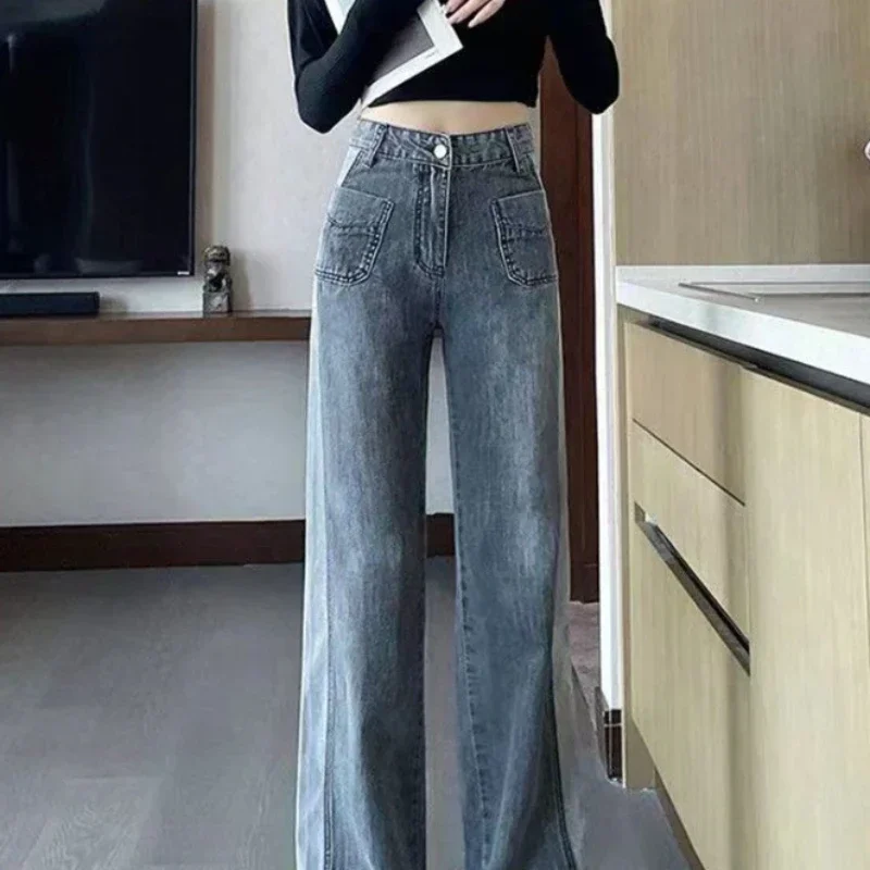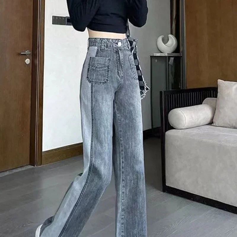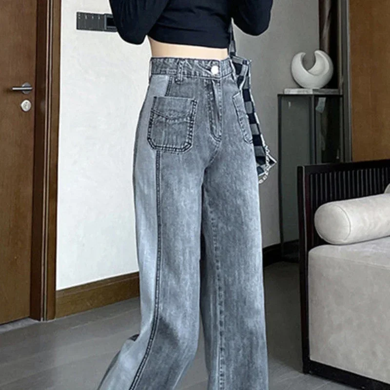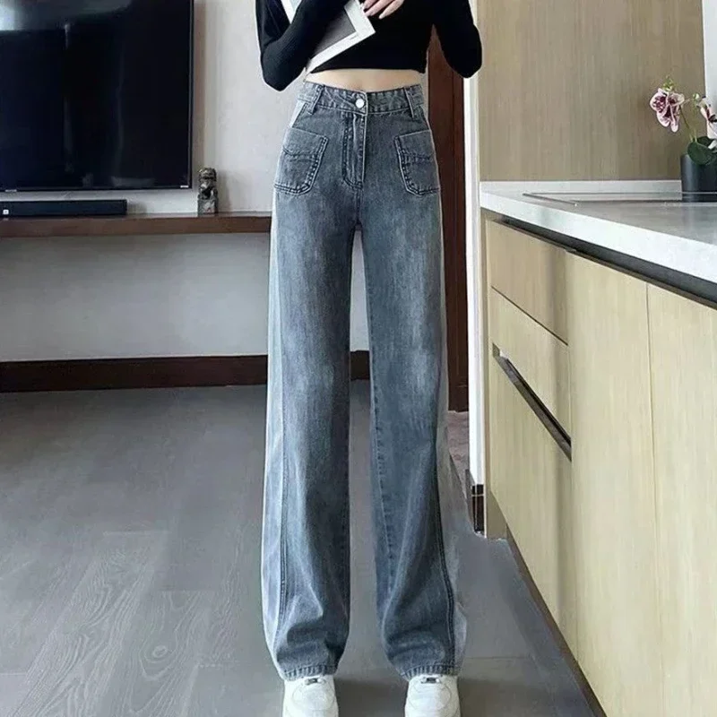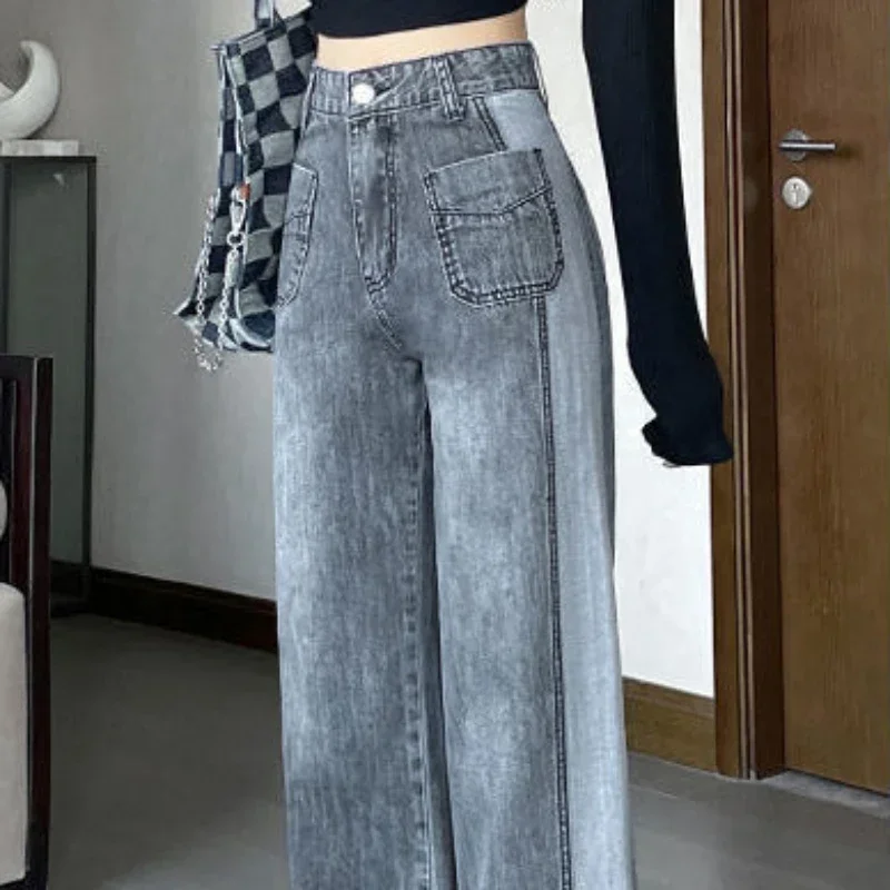 Gray Women’s Jeans with Pockets Pants for Woman High Waist Shot Straight Leg Trousers Streetwear 90s Cheap Chic and Elegant A R