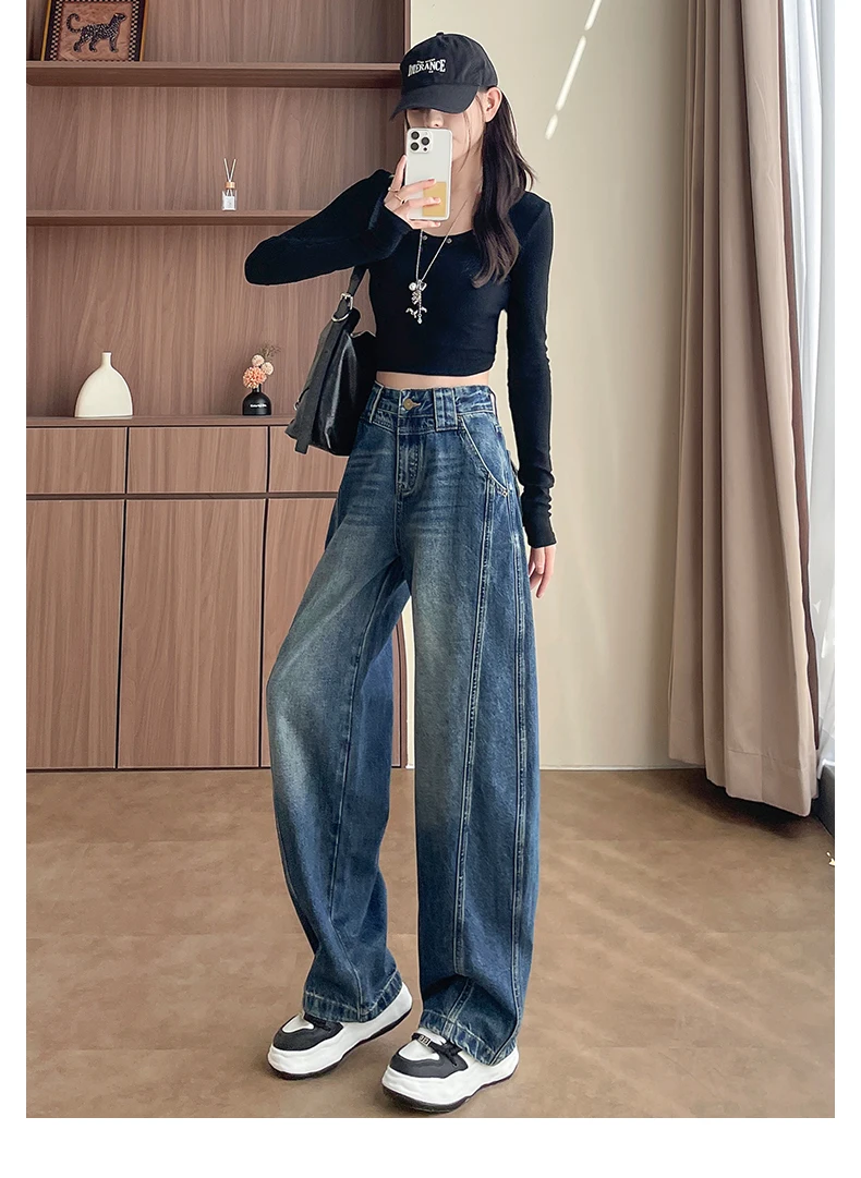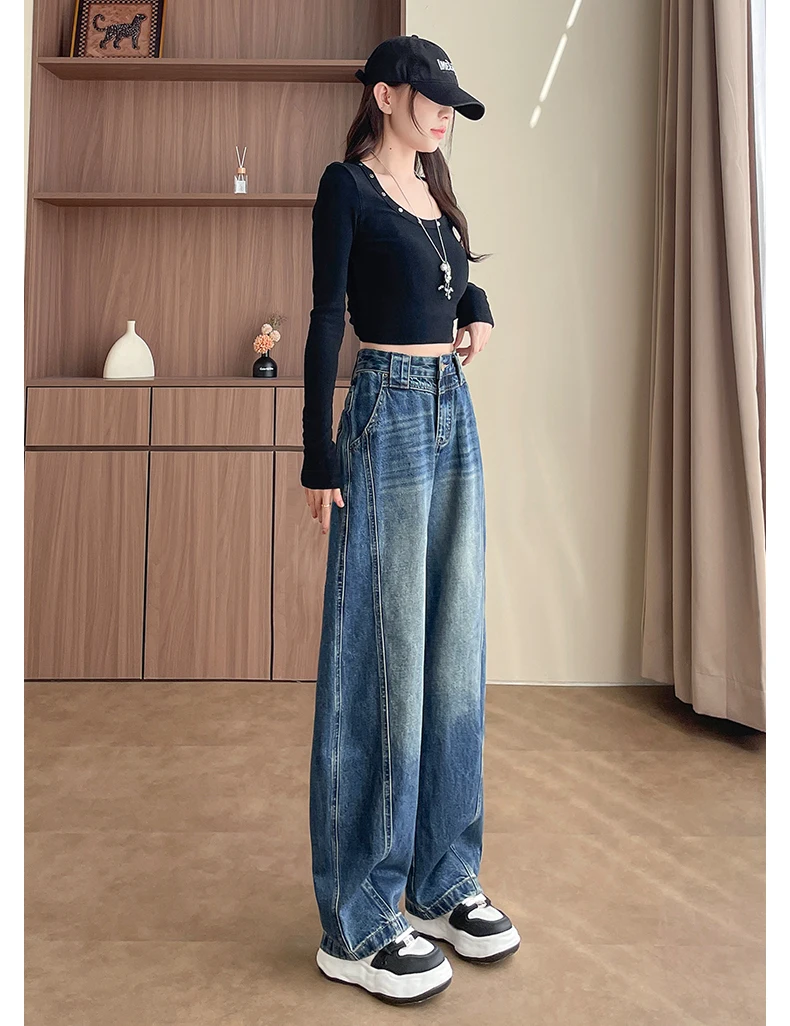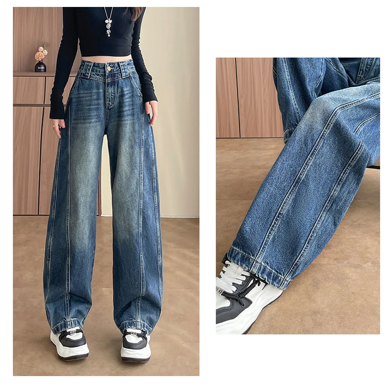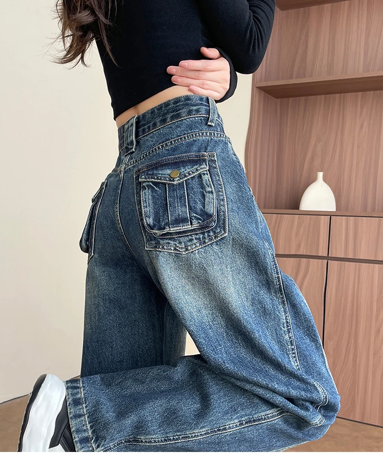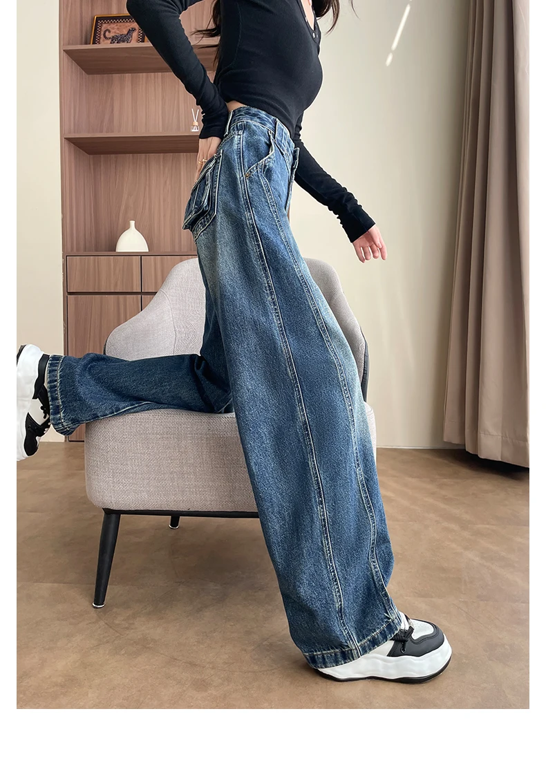 High Waist Loose Wide Leg Jeans Women Y2K Cotton Personalized Design Casual Straight Denim Fashion Tube Loose Plus Trousers