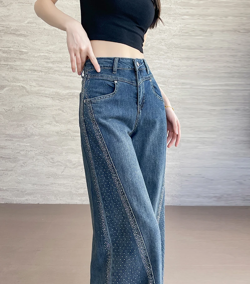 High Waist Wide Leg Jeans For Women Bell Bottom Pants Flared Pants Hotfix Rhinestone Patchwork Dragging Pants