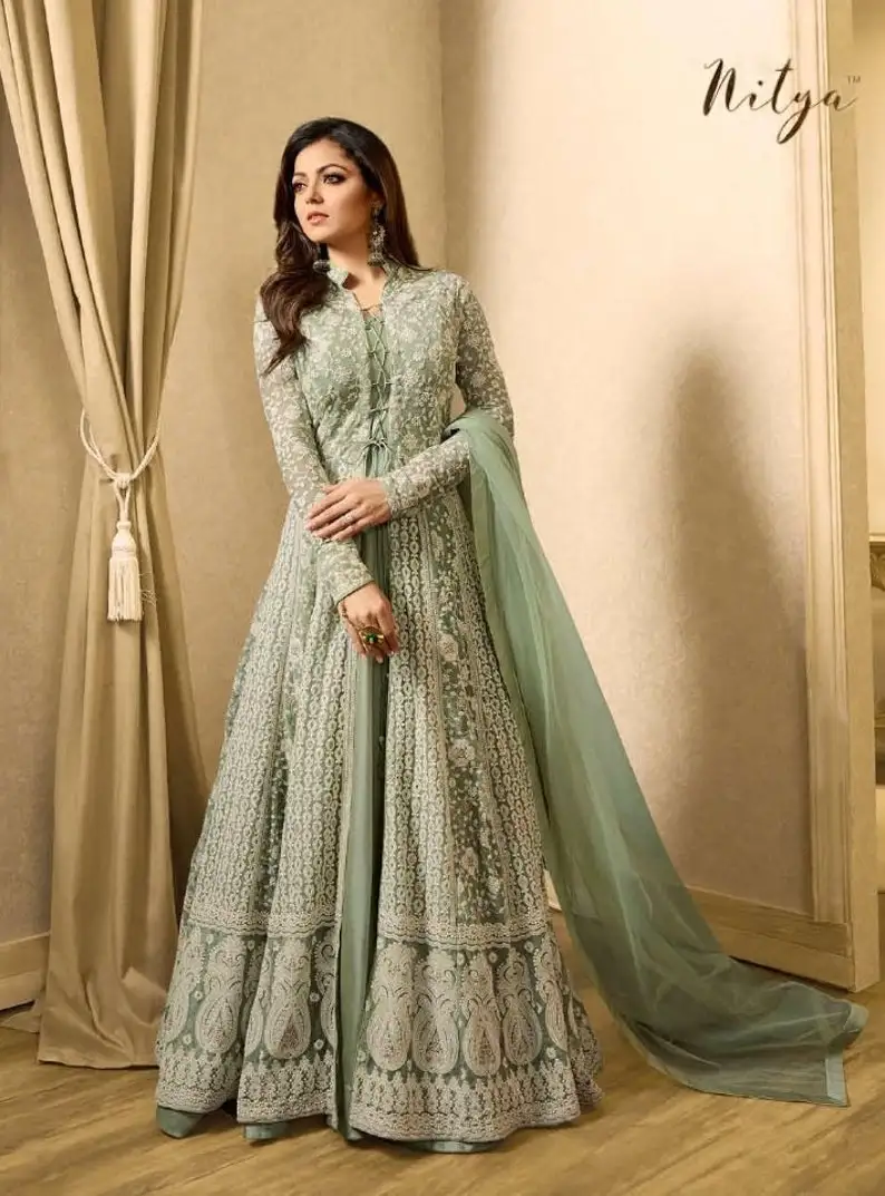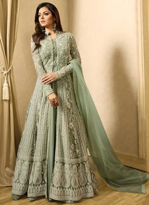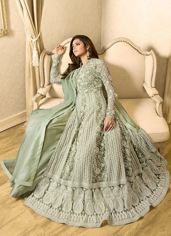 mint green Pakistani prom Dress Embroidery Anarkali Gown lace applique long sleeve caftan kaftan Bollywood Party evening gown