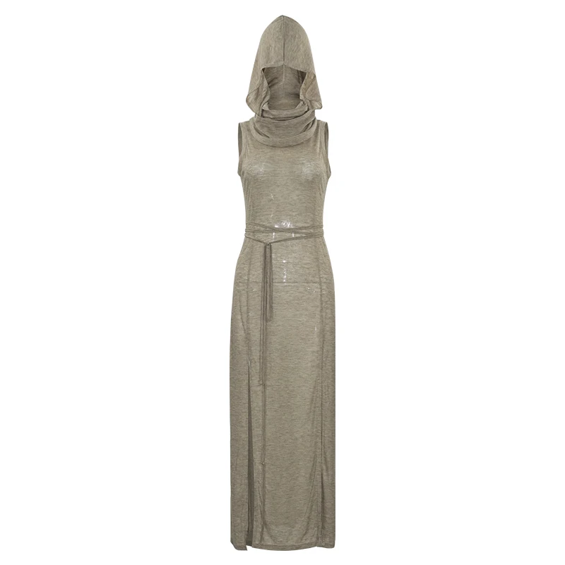 Summer 2023 Sexy European And American Style Sleeveless Hooded Dress Long Split Hollow out Pure Color Women’s Gown