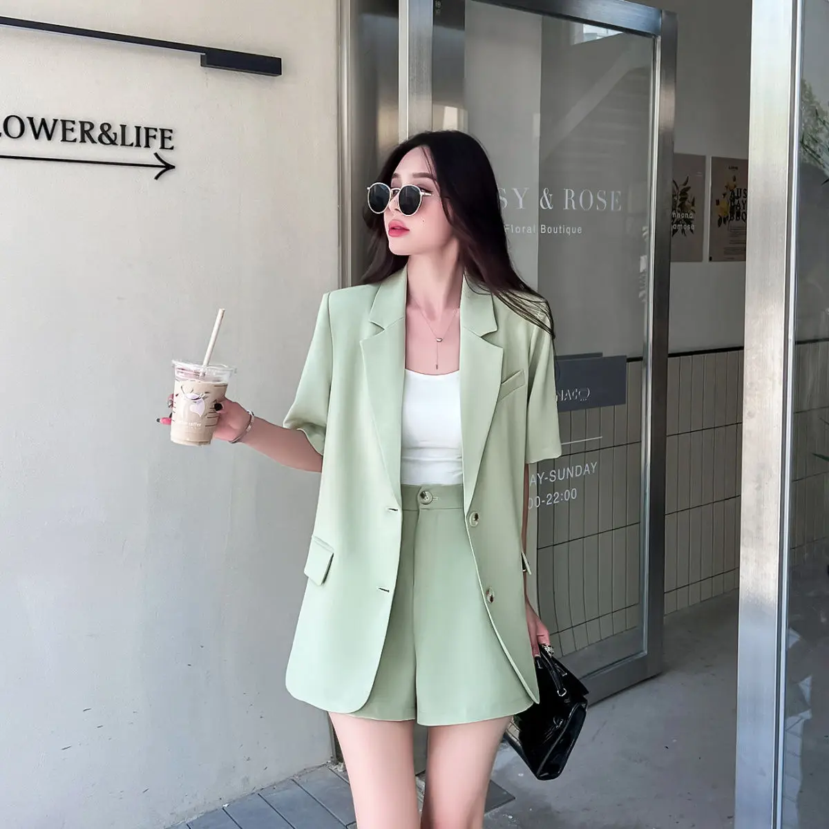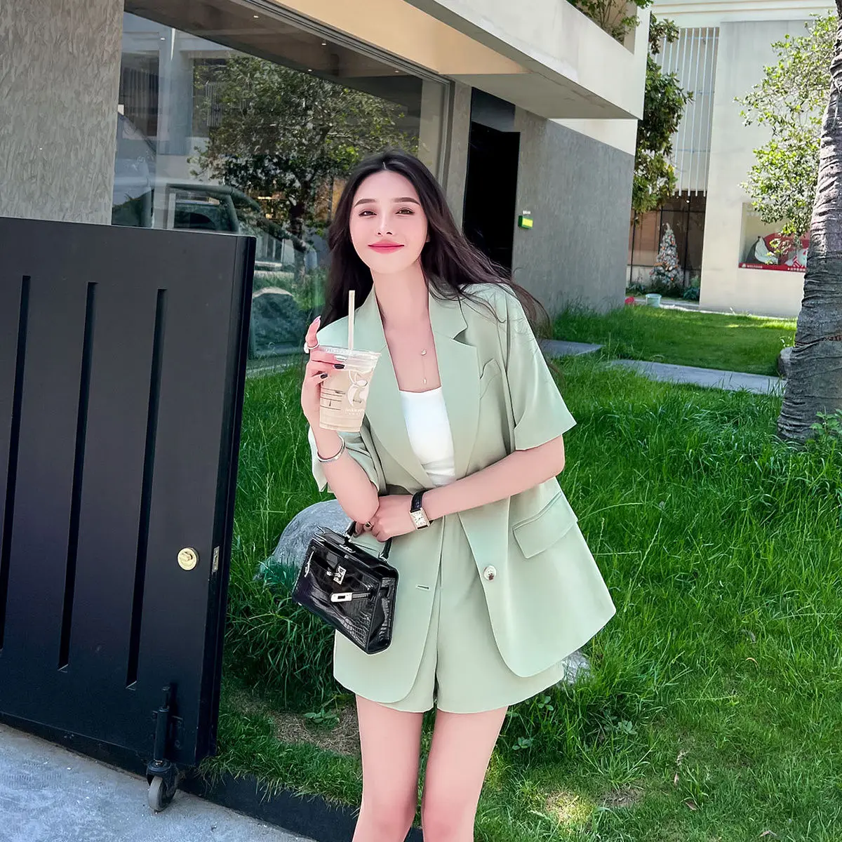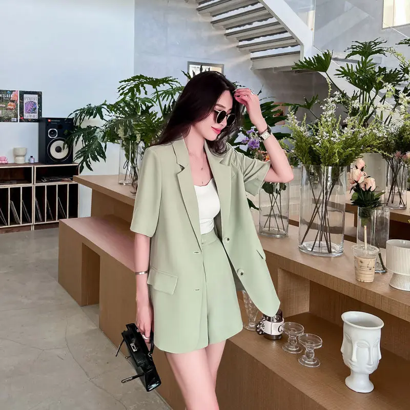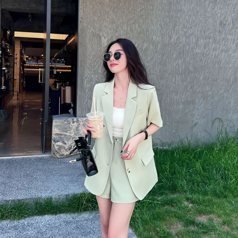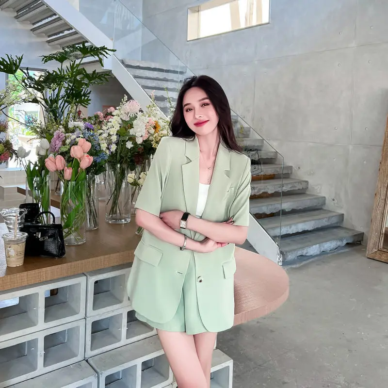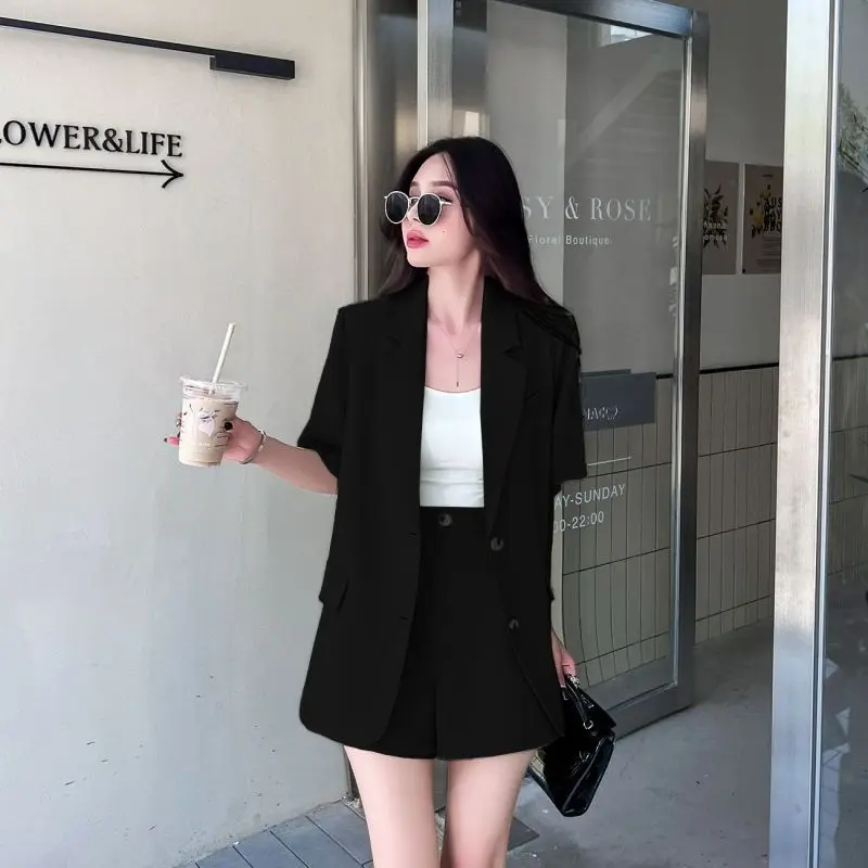 Women Summer New Casual Short Sleeved Blazers Coat Two-piece Korean Elegant Fashion Professional Suit Jacket Shorts Matching Set