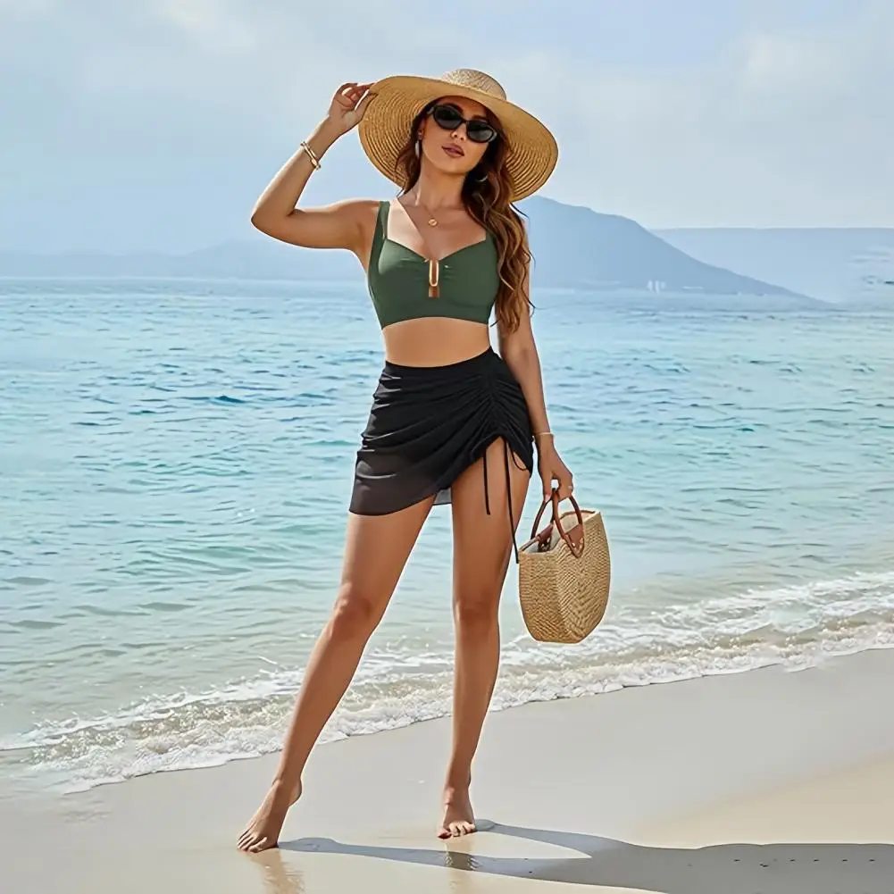 This two-piece women’s bikini set features a comfortable chest pad and a no underwire design, ensuring a secure fit that won’t easily slip off. The metallic decorative bra adds a stylish touch, while the drawstring skirt enhances the fashionable look.