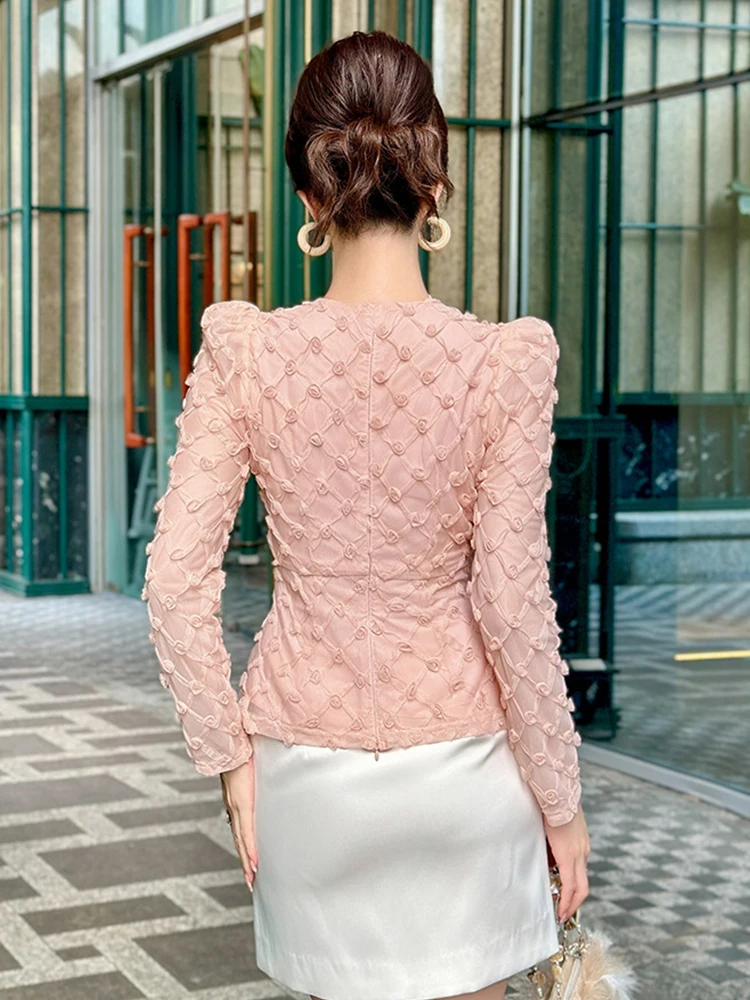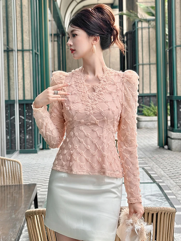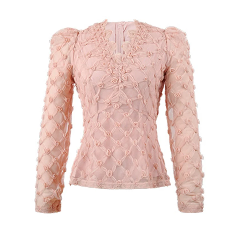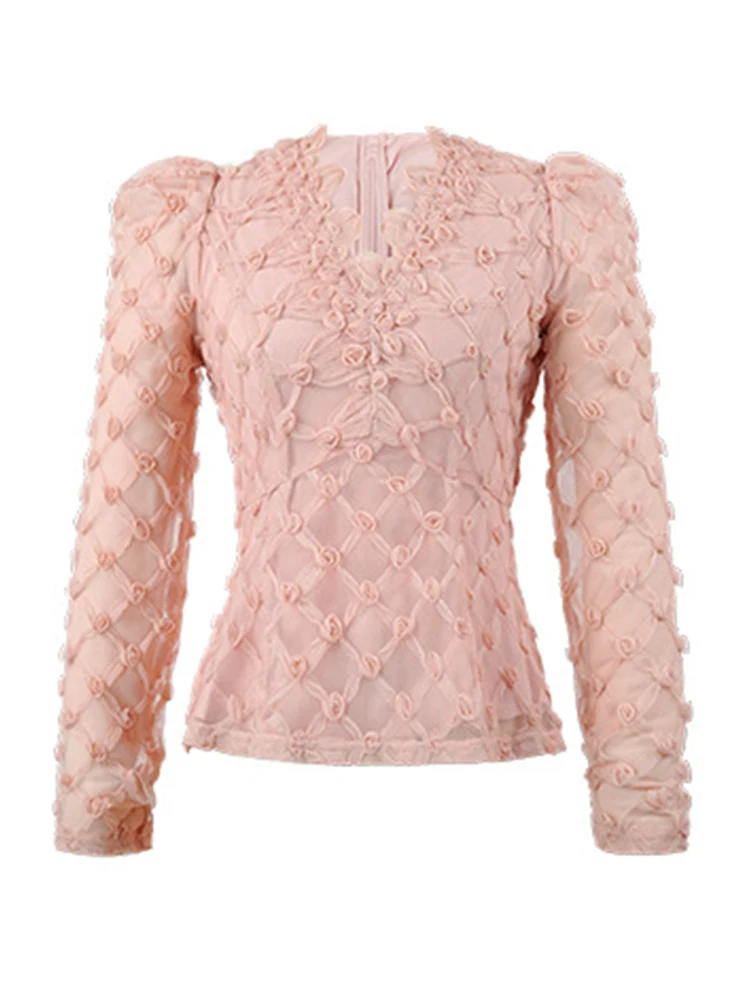 Women’s French Pink Sheer Mesh Blouse 3D Floral Lace Elegant Long Sleeve Tops Female Romantic Date Party Shirt Lady