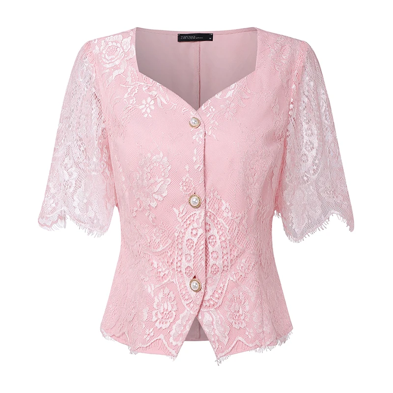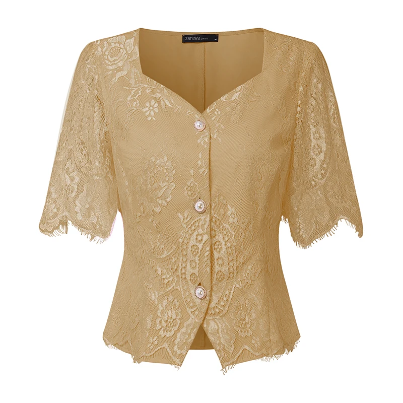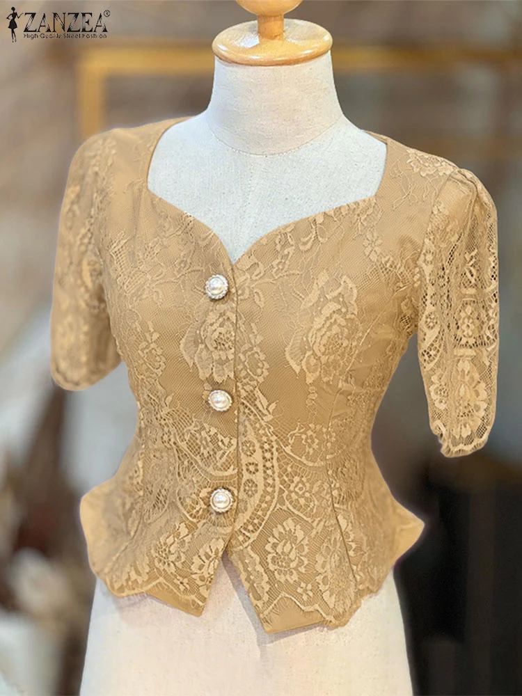 ZANZEA Women Lace Shirts 2025 Summer Square Collar Tunic Tops Fashion Short Sleeve Elegant Office Lady Blouse Buttons OL Blusas